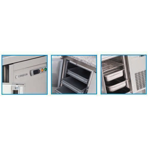 - Dessus granit avec dosseret et joues de 180 mm -Extérieur et intérieur en inox AISI-304 18/10 (sauf partie arrière en Galva) - Thermostat électronique avec afficheur digital, spécial économie d'énergie - Alarme haute et basse température sur contrôleur digital - Evaporateur ventilé traité anti-corrosion - Compresseur hermétique ventilé sur glissières - Evaporation automatique des eaux de dégivrage - Porte emboutie et réversible - Charnière inox - Joint décaissable - Pieds inox réglables en hauteur de 135 à 210 mm - Livré avec 1 clayette rilsan par porte réglable en hauteur sur support inox - Ambiance 43°C