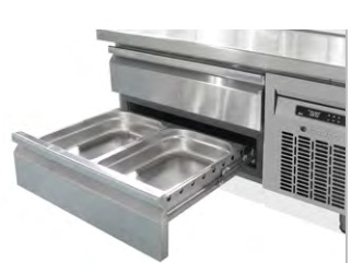 - Tiroirs réfrigérés démontables en inox sur glissières télescopiques avec système d'auto-fermeture