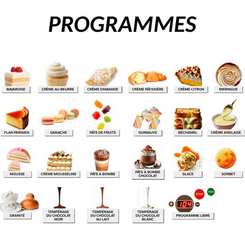 - Programmes préréglés pour : chocolat noir, au lait, blanc, glaces, sorbets, mousses…