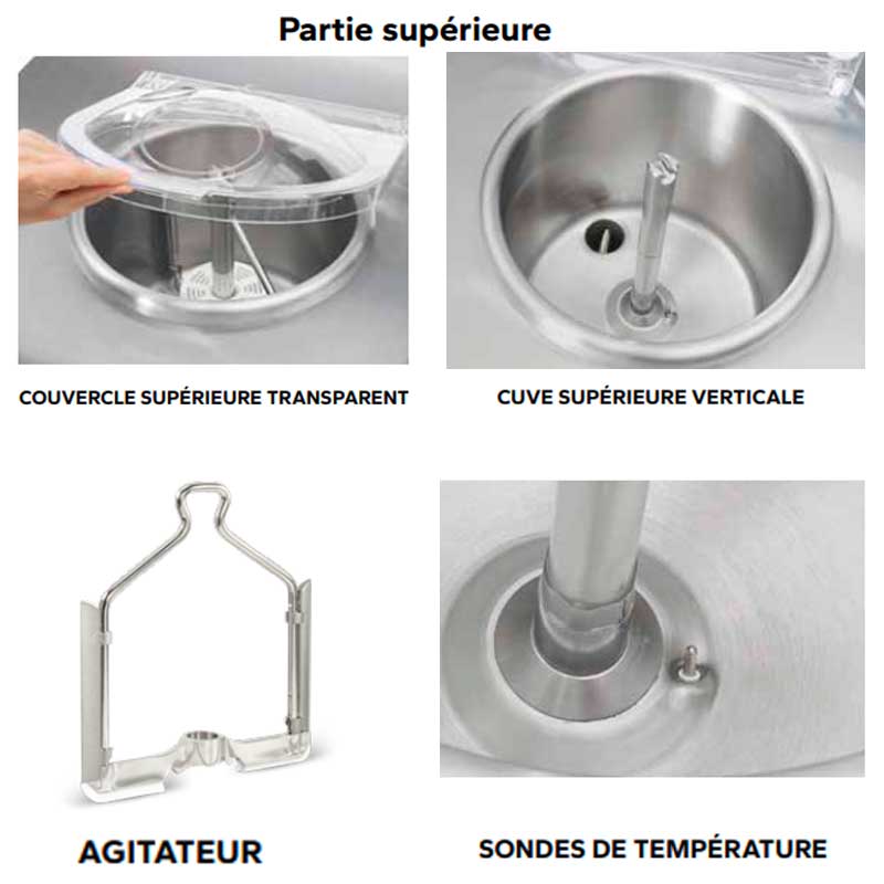 L'agitateur parfaitement ajusté aux parois évite les dépôts de produit. Il est entièrement démontable sans outil, facilitant l’entretien quotidien. La sonde thermique intégrée permet de suivre la température au dixième de degré, garantissant un contrôle optimal du cycle de pasteurisation.