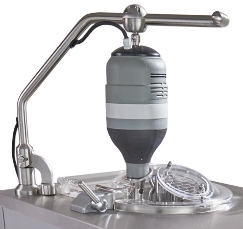 La cuve supérieure verticale permet de chauffer le mélange jusqu’à 115 °C avec une précision de 0,1 °C. Ce processus thermique est indispensable pour solubiliser les ingrédients secs, activer les stabilisants et éliminer la charge microbienne. Le couvercle transparent moulé en polycarbonate permet un suivi visuel du processus et son soupirail assure la gestion de l’évaporation.