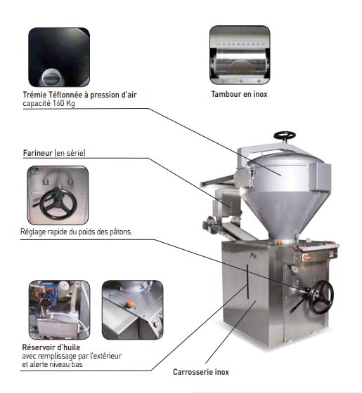 -Ce système vous assure une très bonne précision et régularité de pesage ainsi qu’un grand respect de la pâte grâce à sa course de piston limitée.