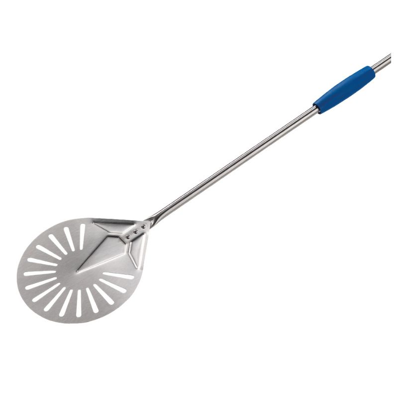 - Manche en acier inox, muni d'une poignée fixe et une coulissante en plastique bleu.