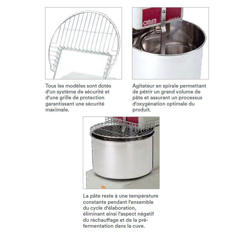 Tous les modèles sont dotés d'un système de sécurité et d'une grille de protection garantissant une sécurité maximale. Agitateur en spirale permettant de pétrir un grand volume de pâte et assurant un processus d'oxygénation optimale du produit. La pâte reste à une température constante pendant l'ensemble du cycle d'élaboration, éliminant ainsi l'aspect négatif du réchauffage et de la préfermentation dans la cuve.