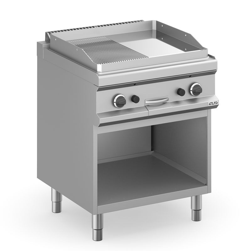 La plaque 1/2 lisse 1/2 rainurée gaz sur baie libre MBM, modèle MFTG77ALR, est une solution polyvalente pour la cuisson professionnelle.