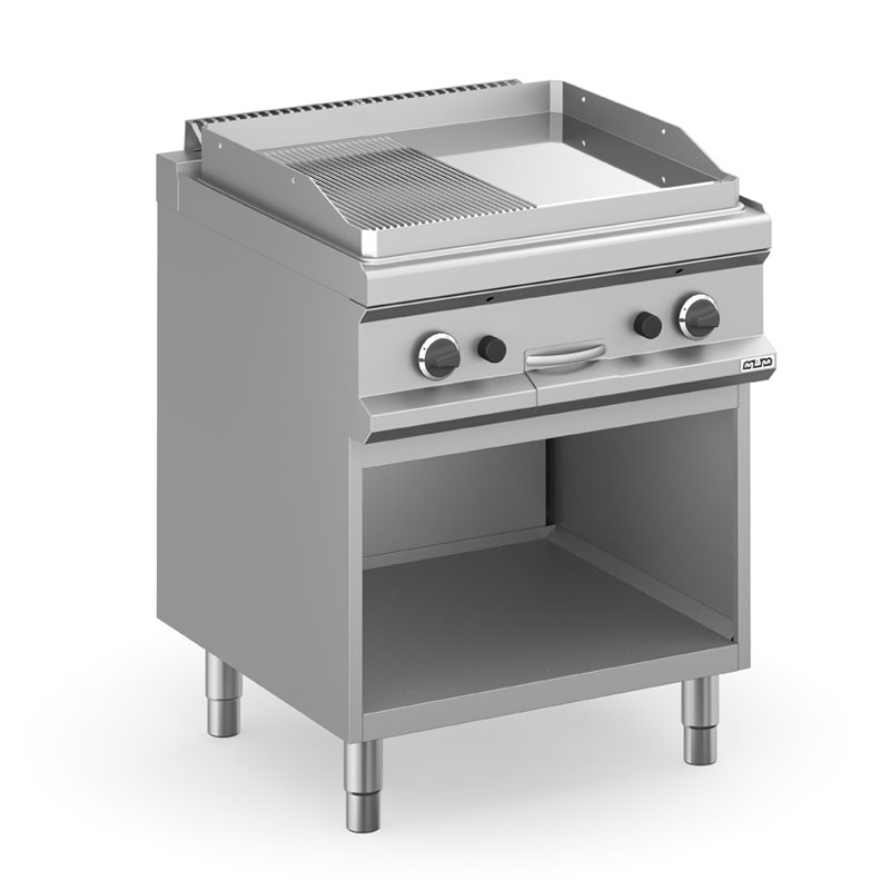 La plaque de cuisson intégrée dans le dessus est en acier doux, avec finition chrome lisse ou dur, et a épaisseur de 15 mm. Déchargement des graisses dans un tiroir amovible en acier inoxydable avec capacité jusqu'à 2 litres, pour faciliter le nettoyage. Les cuissons différenciée (en modules de 70) sont possibles grâce aux brûleurs / éléments chauffants électriques indépendant. La finition chromée permet des cuissons successives de différents aliments sans risque de transfert odeurs et saveurs lors du passage d'une cuisson à une autre.