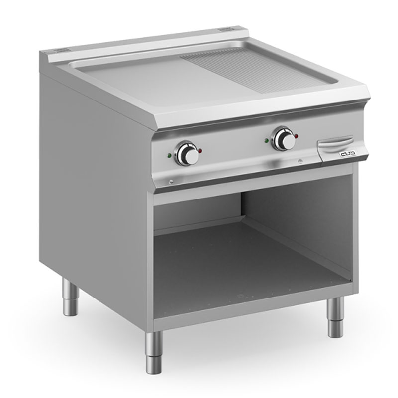 La plaque 2 zones 1/3 rainurée acier électrique MBM, modèle FTBE98ALR, est un équipement de cuisine professionnel conçu pour offrir une cuisson électrique polyvalente.