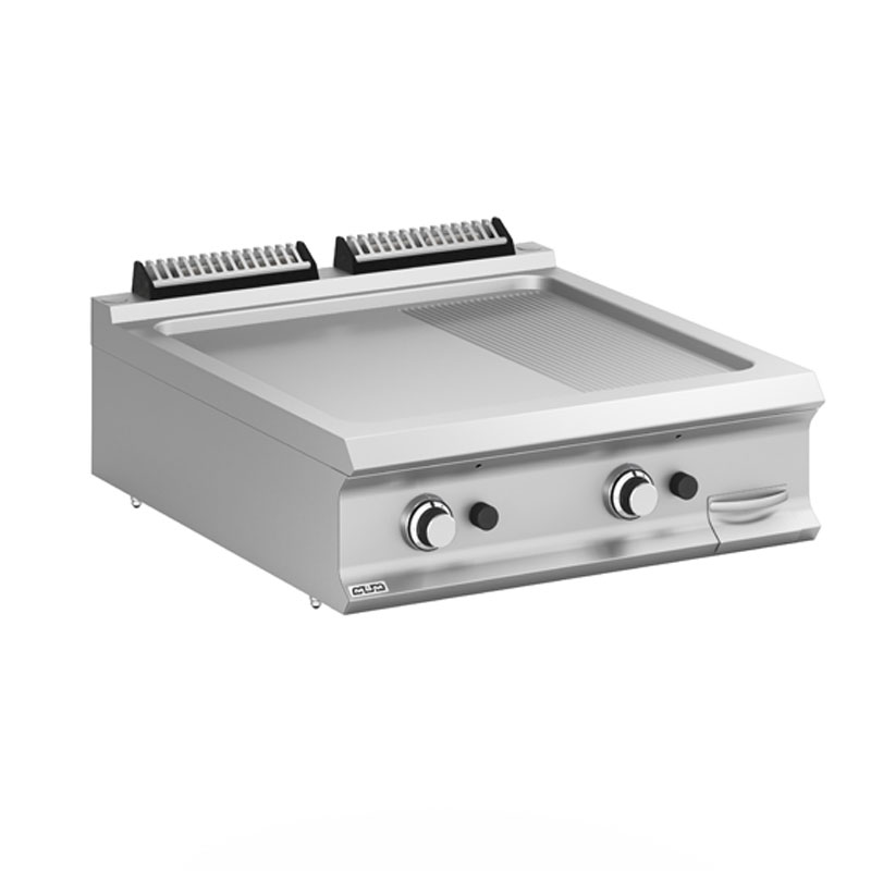La plaque 2 zones 1/3 rainurée acier gaz à poser MBM, modèle FTBG98TLR, est un équipement de cuisson polyvalent conçu pour répondre aux besoins des cuisines professionnelles. Voici un aperçu des caractéristiques clés de ce produit :