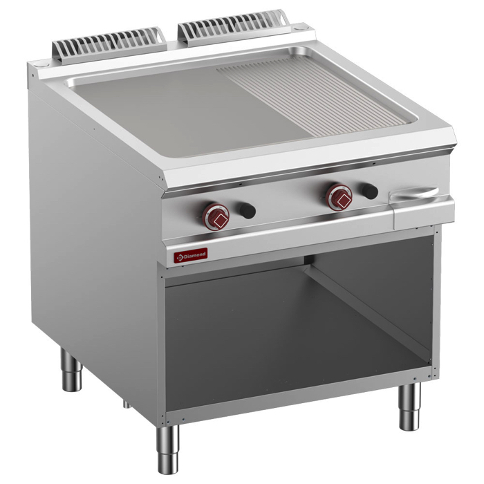 Plaque de cuisson en fonte (15 mm) à haute conductibilité thermique, inclinée en avant et munie d'un rebord anti-éclaboussures sur 3 côtés soudé (3 mm) en acier inox, garantissant une parfaite étanchéité. Un tiroir de récupération du jus de cuisson est positionné sur la façade avant de l'appareil.