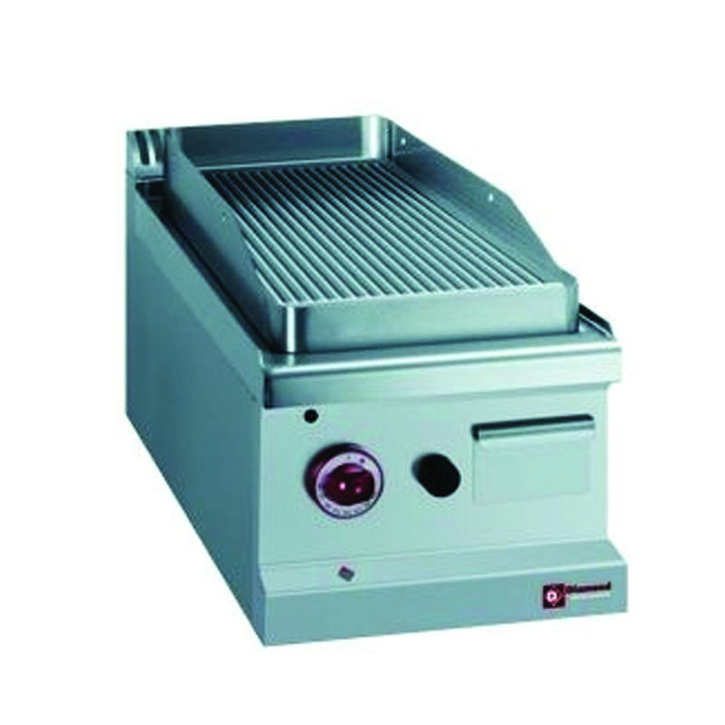 - Plaque de cuisson en fonte à haute conductibilité thermique, munie d'un rebord périphérique soudé garantissant une parfaite étanchéité. Un tiroir de récupération du jus de cuisson est positionné sur la façade avant de l'appareil.