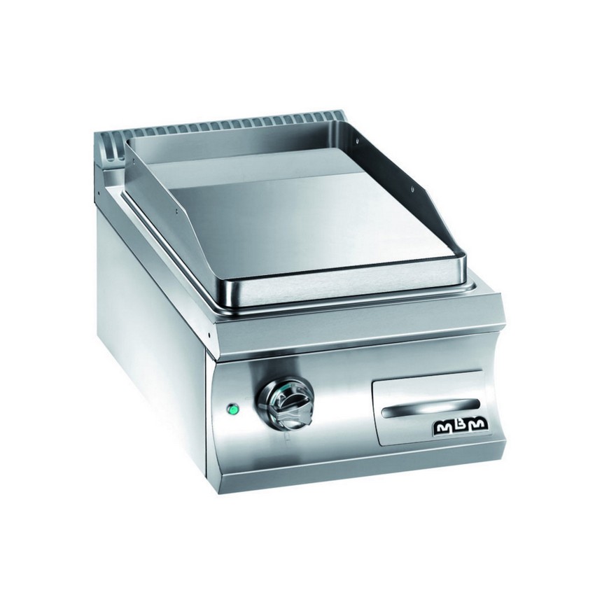 Le plan de travail est réalisé en acier inoxydable AISI304 18/10 d'une épaisseur de 1 mm Le rebord anti-projections en acier inoxydable AISI 304 d'une épaisseur de 3 mm est soudé à la plaque pour offrir une meilleure simplicité d'utilisation et de nettoyage. La plaque aux angles arrondis est disponible en acier poli ou finition chrome; elle possède une épaisseur de 15 mm, et est légèrement incline pour faciliter l'écoulement des graisses dans un tiroir réceptacle amovible d'une contenance jusqu'à 2 litres. Sur les plaques les plus larges (70 cm) différentes cuissons peuvent être réalisées grace à deux éléments de chauffe indépendants. La finition chrome (mod. LC et LRC) permet d'effectuer des cuissons diverses à la suite les unes des autres sans transfert de gout et dodeurs des aliments entre eux. En outre de faciliter le nettoyage la finition chrome se caractérise par une moindre dispersion de la chaleur, permettant ainsi de travailler dans un environnement plus confortable. Versions gaz: bruleurs en acier à flamme stabilisée, et regulation thermostatique de la temperature pour une réactivité rapide. Flamme pilote avec vanne de sécurité. Allumage pîezzo. Versions électriques: résistances blindées, contrôle thermostatique de la temperature.