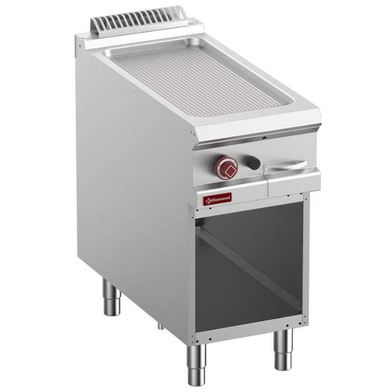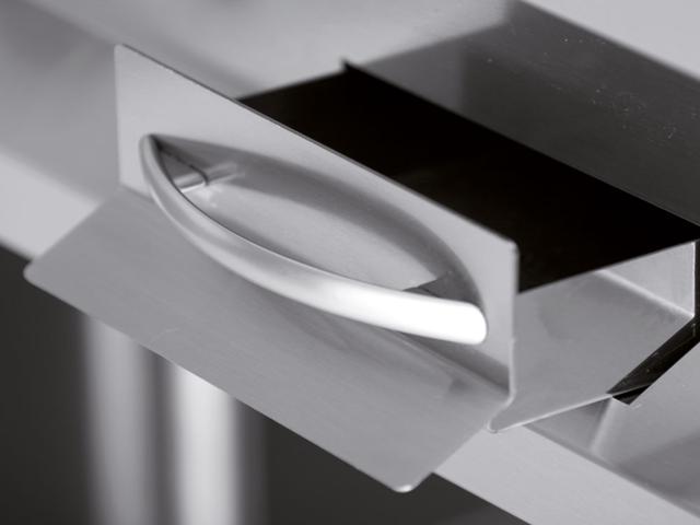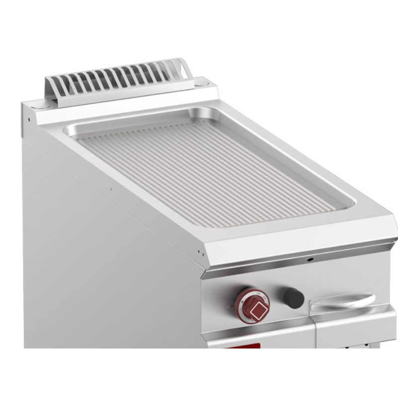 - Plaque de cuisson en fonte (15 mm) à haute conductibilité thermique, inclinée en avant et munie d'un rebord anti-éclaboussures sur 3 côtés soudé (3 mm) en acier inox, garantissant une parfaite étanchéité. Un tiroir de récupération du jus de cuisson est positionné sur la façade avant de l'appareil.