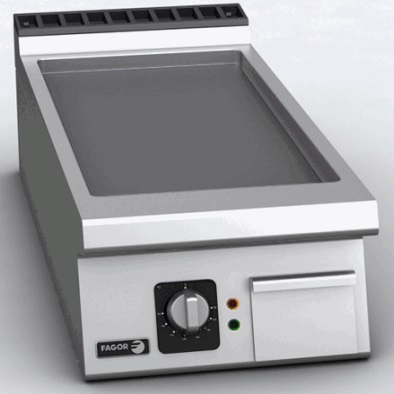 - Produit conçu en acier inox AISI 304, de 2 mm d’épaisseur, plan de travail embouti. Découpe laser, soudure et polissage robotisés facilitant l’assemblage des fonctions, le nettoyage et l’entretien. - Plaque de cuisson fabriquée en acier au carbone de 20 mm d’épaisseur, de mise en température rapide et puissance élevée. - Modèles avec grils lisses, striés ou mixtes (2/3 lisses + 1/3 à rayures). - Versions avec surface en chrome de 50 microns d’épaisseur pour les trois types de grils. - Chauffage électrique par résistances blindées en acier inoxydable; régulation par vanne entre 100 et 300 ºC. - Brûleurs à double tubulure (un brûleur pour les modèles de demi-module, deux brûleurs indépendants pour les modèles d’un module). - Contrôle de la température par robinet thermostatique (entre 100 et 300 °C) pour plaque chromée. - Vanne gaz sur les modèles plaques acier carbone. - Allumage des brûleurs avec train d’étincelles électronique. Ils disposent d’un tube d’accès pour l’allumage manuel. - Gaz: Module avec deux zones de chauffage indépendantes. - Thermostat de sécurité sur les modèles avec contrôle thermostatique. - Grande rapidité de réaction et récupération de la température sur le gril. - Les plaques sont intégrées dans le plan de travail embouti. - Plan de travail embouti avec arêtes arrondies pour une facilité de nettoyage. - Inclinaison de la plaque vers l’avant afin de faciliter la récupération des graisses et des liquides. - Tiroir de récupération d’une capacité allant jusqu’à 2 litres selon les modèles. - Protections latérales et arrières antiéclaboussures en option, facilement démontables. - Protecteur de cheminée en fonte émaillée haute température. - Accès aux composants de la partie avant. - Appareils avec protection de niveau IPX5 contre l'eau. Accessoires optionnels (voir page des accessoires à la fin du chapitre) - Raclette (*). - Protection anti-éclaboussure (en 3 pièces afin de faciliter le nettoyage). Voltage modèles électriques - 400 V 3+N. Consulter pour d'autres voltages.