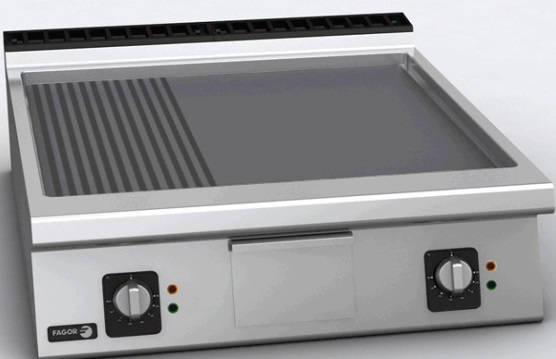 - Produit conçu en acier inox AISI 304, de 2 mm d’épaisseur, plan de travail embouti. Découpe laser, soudure et polissage robotisés facilitant l’assemblage des fonctions, le nettoyage et l’entretien. - Plaque de cuisson fabriquée en acier au carbone de 20 mm d’épaisseur, de mise en température rapide et puissance élevée. - Modèles avec grils lisses, striés ou mixtes (2/3 lisses + 1/3 à rayures). - Versions avec surface en chrome de 50 microns d’épaisseur pour les trois types de grils. - Chauffage électrique par résistances blindées en acier inoxydable; régulation par vanne entre 100 et 300 ºC. - Brûleurs à double tubulure (un brûleur pour les modèles de demi-module, deux brûleurs indépendants pour les modèles d’un module). - Contrôle de la température par robinet thermostatique (entre 100 et 300 °C) pour plaque chromée. - Vanne gaz sur les modèles plaques acier carbone. - Allumage des brûleurs avec train d’étincelles électronique. Ils disposent d’un tube d’accès pour l’allumage manuel. - Gaz: Module avec deux zones de chauffage indépendantes. - Thermostat de sécurité sur les modèles avec contrôle thermostatique. - Grande rapidité de réaction et récupération de la température sur le gril. - Les plaques sont intégrées dans le plan de travail embouti. - Plan de travail embouti avec arêtes arrondies pour une facilité de nettoyage. - Inclinaison de la plaque vers l’avant afin de faciliter la récupération des graisses et des liquides. - Tiroir de récupération d’une capacité allant jusqu’à 2 litres selon les modèles. - Protections latérales et arrières antiéclaboussures en option, facilement démontables. - Protecteur de cheminée en fonte émaillée haute température. - Accès aux composants de la partie avant. - Appareils avec protection de niveau IPX5 contre l'eau. Accessoires optionnels (voir page des accessoires à la fin du chapitre) - Raclette (*). - Protection anti-éclaboussure (en 3 pièces afin de faciliter le nettoyage). Voltage modèles électriques - 400 V 3+N. Consulter pour d'autres voltages.