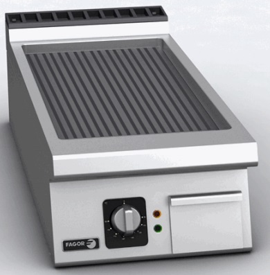 - Produit conçu en acier inox AISI 304, de 2 mm d’épaisseur, plan de travail embouti. Découpe laser, soudure et polissage robotisés facilitant l’assemblage des fonctions, le nettoyage et l’entretien. - Plaque de cuisson fabriquée en acier au carbone de 20 mm d’épaisseur, de mise en température rapide et puissance élevée. - Modèles avec grils lisses, striés ou mixtes (2/3 lisses + 1/3 à rayures). - Versions avec surface en chrome de 50 microns d’épaisseur pour les trois types de grils. - Chauffage électrique par résistances blindées en acier inoxydable; régulation par vanne entre 100 et 300 ºC. - Brûleurs à double tubulure (un brûleur pour les modèles de demi-module, deux brûleurs indépendants pour les modèles d’un module). - Contrôle de la température par robinet thermostatique (entre 100 et 300 °C) pour plaque chromée. - Vanne gaz sur les modèles plaques acier carbone. - Allumage des brûleurs avec train d’étincelles électronique. Ils disposent d’un tube d’accès pour l’allumage manuel. - Gaz: Module avec deux zones de chauffage indépendantes. - Thermostat de sécurité sur les modèles avec contrôle thermostatique. - Grande rapidité de réaction et récupération de la température sur le gril. - Les plaques sont intégrées dans le plan de travail embouti. - Plan de travail embouti avec arêtes arrondies pour une facilité de nettoyage. - Inclinaison de la plaque vers l’avant afin de faciliter la récupération des graisses et des liquides. - Tiroir de récupération d’une capacité allant jusqu’à 2 litres selon les modèles. - Protections latérales et arrières antiéclaboussures en option, facilement démontables. - Protecteur de cheminée en fonte émaillée haute température. - Accès aux composants de la partie avant. - Appareils avec protection de niveau IPX5 contre l'eau. Accessoires optionnels (voir page des accessoires à la fin du chapitre) - Raclette (*). - Protection anti-éclaboussure (en 3 pièces afin de faciliter le nettoyage). Voltage modèles électriques - 400 V 3+N. Consulter pour d'autres voltages.