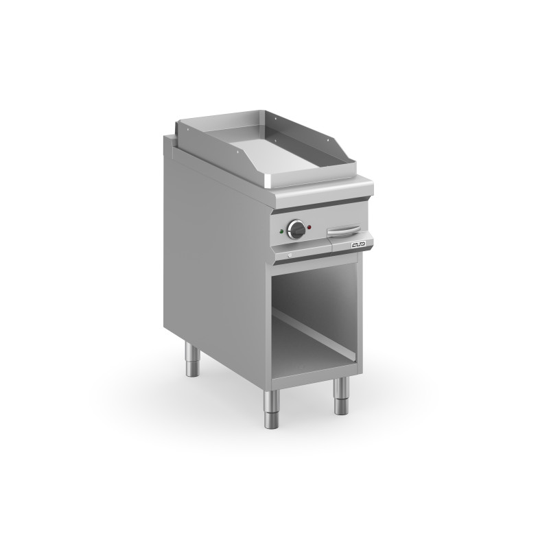 La plaque de cuisson intégrée dans le dessus est en acier doux, avec finition chrome lisse ou dur, et a épaisseur de 15 mm. Déchargement des graisses dans un tiroir amovible en acier inoxydable avec capacité jusqu'à 2,5 litres, pour faciliter le nettoyage. Les cuissons différenciée (en modules de 70) sont possibles grâce aux brûleurs / éléments chauffants électriques indépendant. La finition chromée permet des cuissons successives de différents aliments sans risque de transfert odeurs et saveurs lors du passage d'une cuisson à une autre. En plus de faciliter le nettoyage, le revêtement le chrome réduit la dissipation thermique, favorisant environnement de travail plus confortable. Plan de travail en acier inoxydable AISI 18/10 épaisseur 1 mm. Alignement de modules par juxtaposition.