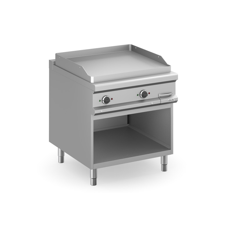 La plaque de cuisson intégrée dans le dessus est en acier doux, avec finition chrome lisse ou dur, et a épaisseur de 15 mm. Déchargement des graisses dans un tiroir amovible en acier inoxydable avec capacité jusqu'à 2,5 litres, pour faciliter le nettoyage. Les cuissons différenciée (en modules de 70) sont possibles grâce aux brûleurs / éléments chauffants électriques indépendant. La finition chromée permet des cuissons successives de différents aliments sans risque de transfert odeurs et saveurs lors du passage d'une cuisson à une autre. En plus de faciliter le nettoyage, le revêtement le chrome réduit la dissipation thermique, favorisant environnement de travail plus confortable. Plan de travail en acier inoxydable AISI 18/10 épaisseur 1 mm. Alignement de modules par juxtaposition.