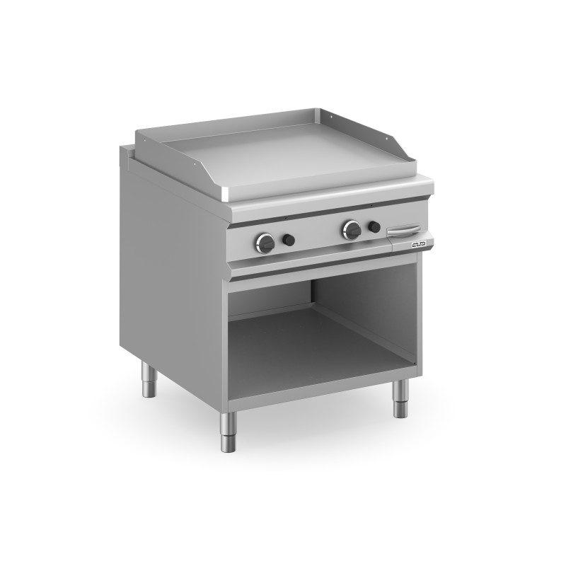 La plaque de cuisson intégrée dans le dessus est en acier doux, avec finition chrome lisse ou dur, et a épaisseur de 15 mm. Déchargement des graisses dans un tiroir amovible en acier inoxydable avec capacité jusqu'à 2,5 litres, pour faciliter le nettoyage. Les cuissons différenciée (en modules de 70) sont possibles grâce aux brûleurs / éléments chauffants électriques indépendant. La finition chromée permet des cuissons successives de différents aliments sans risque de transfert odeurs et saveurs lors du passage d'une cuisson à une autre. En plus de faciliter le nettoyage, le revêtement le chrome réduit la dissipation thermique, favorisant environnement de travail plus confortable. Plan de travail en acier inoxydable AISI 18/10 épaisseur 1 mm. Alignement de modules par juxtaposition.