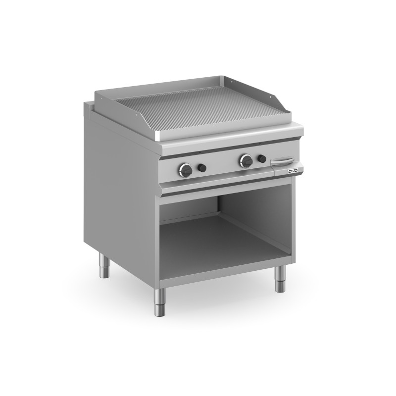 La plaque de cuisson intégrée dans le dessus est en acier doux, avec finition chrome lisse ou dur, et a épaisseur de 15 mm. Déchargement des graisses dans un tiroir amovible en acier inoxydable avec capacité jusqu'à 2,5 litres, pour faciliter le nettoyage. Les cuissons différenciée (en modules de 70) sont possibles grâce aux brûleurs / éléments chauffants électriques indépendant. La finition chromée permet des cuissons successives de différents aliments sans risque de transfert odeurs et saveurs lors du passage d'une cuisson à une autre. En plus de faciliter le nettoyage, le revêtement le chrome réduit la dissipation thermique, favorisant environnement de travail plus confortable. Plan de travail en acier inoxydable AISI 18/10 épaisseur 1 mm. Alignement de modules par juxtaposition.