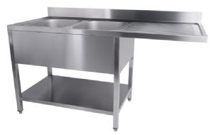 Typology : sur pieds avec étagère inférieure Dimensions (mm) : 1600x700x850 mm Plan de travail en acier avec dosseret de 40 mm d'épaisseur Dosseret h 100 mm Avec panneau de couverture de la cuve
