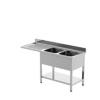 Typology : sur pieds avec étagère inférieure Dimensions (mm) : 1800x700x850 mm Plan de travail en acier avec dosseret de 40 mm d'épaisseur Dosseret h 100 mm Avec panneau de couverture de la cuve
