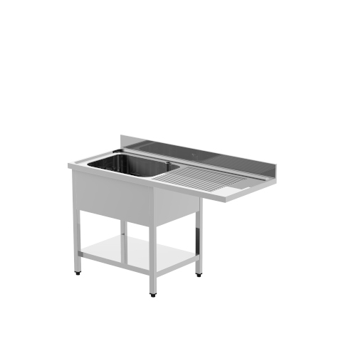 Typology : sur pieds avec étagère inférieure Dimensions (mm) : 1200x700x850 mm Plan de travail en acier avec dosseret de 40 mm d'épaisseur Dosseret h 100 mm Avec panneau de couverture de la cuve