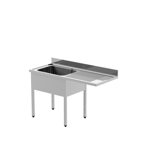 Typology : sur pieds Dimensions (mm) : 1200x700x900 mm Plan de travail en acier avec dosseret de 40 mm d'épaisseur Dosseret h 100 mm Avec panneau de couverture de la cuve