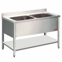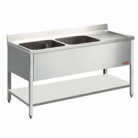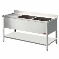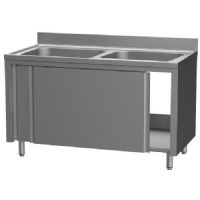 Typology : avec portes coulissantes Dimensions (mm) : 1600x700x850 mm Plan de travail en acier avec dosseret de 40 mm d'épaisseur Dosseret h 100 mm Avec panneau de couverture de la cuve et portes coulissantes