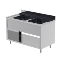 Typology : avec portes coulissantes Dimensions (mm) : 1200x700x850 mm Plan de travail en acier avec dosseret de 40 mm d'épaisseur Dosseret h 100 mm Avec panneau de couverture de la cuve et portes coulissantes
