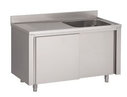 Typology : avec portes coulissantes Dimensions (mm) : 1200x700x850 mm Plan de travail en acier avec dosseret de 40 mm d'épaisseur Dosseret h 100 mm Avec panneau de couverture de la cuve et portes coulissantes
