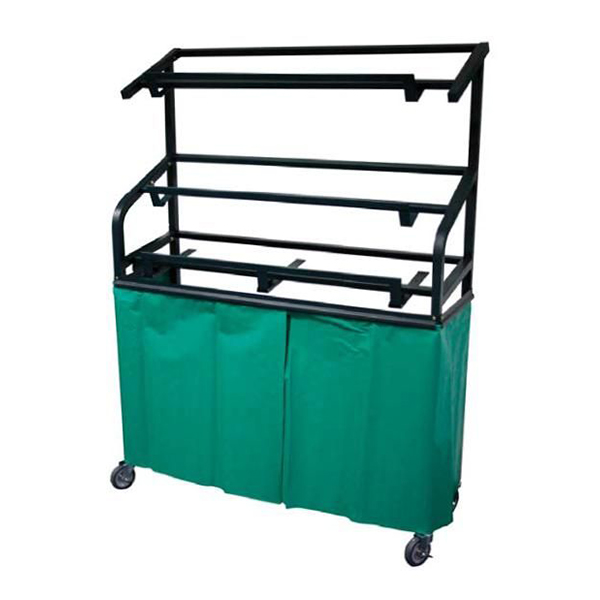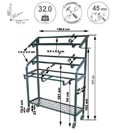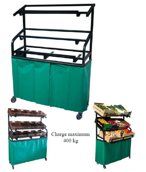 Ce présentoir pour fruits et légumes en trois niveaux permet de mettre trois cageots par niveau. La tablette du premier niveau est réglable en profondeur. Ce meuble possède un rideau bâche verte et une finition peinture Epoxy vert. Ce présentoir primeur de neuf cageots (non fournis) est livré démonté.