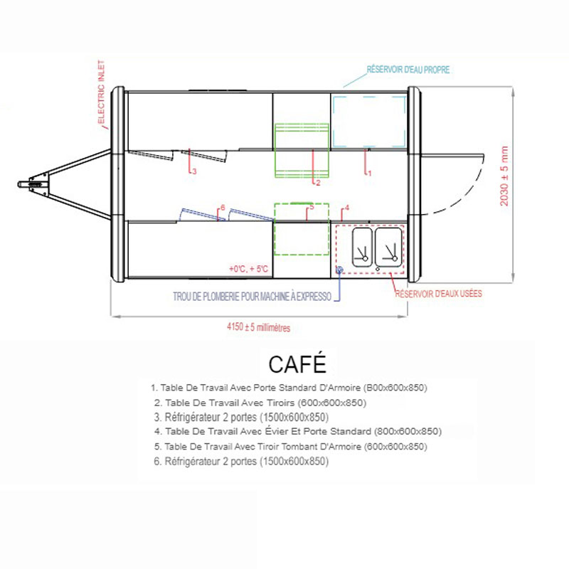 - Spécialité Café : Conçue spécifiquement pour la vente de café et de boissons, cette remorque est équipée de tout le nécessaire pour préparer et servir des boissons de manière optimale.