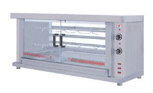 La rôtissoire électrique est un équipement de cuisine professionnelle utilisé pour cuire de la viande ou de la volaille. Elle se compose d'une structure en acier inoxydable résistante à la chaleur et de broches rotatives sur lesquelles sont fixées les pièces de viande. Les broches sont entraînées par un moteur électrique et sont équipées de deux résistances pour une cuisson uniforme. La rôtissoire électrique peut être contrôlée grâce à un thermostat pour régler la température de cuisson, ainsi qu'un minuteur pour définir la durée de cuisson.