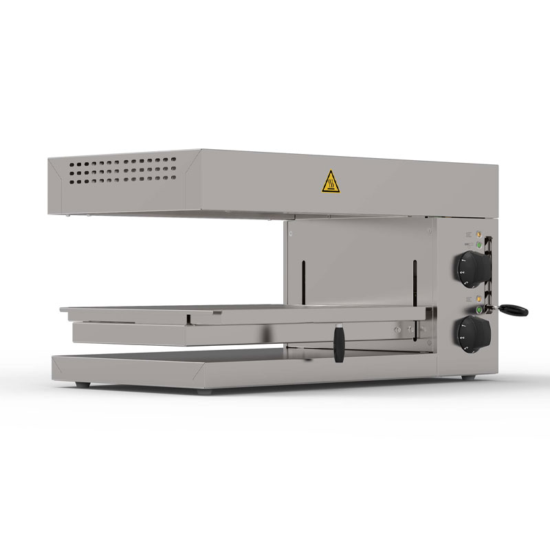 Fabriqué en acier inoxydable. Plaque supérieure mobile, se rapprochant ou se rapprochant des aliments à cuire. Possibilité de chauffer seulement la moitié de la surface. Possibilité d'accrocher l'appareil au mur à l'aide de supports spéciaux (à demander). Éléments chauffants blindés Incoloy. Éléments chauffants inclinables pour un nettoyage facile sous le pont en mouvement. Gouttières en acier inoxydable et grilles en acier chromé équipées de poignées résistantes à la chaleur, amovibles et munies d'un arrêt de sécurité.
