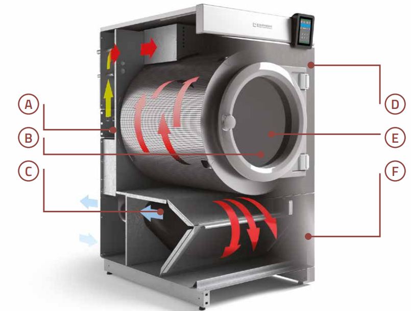 - Sécurités multiples : à l'ouverture du tambour, au panneau d'inspection du filtre et à la température d'échappement.