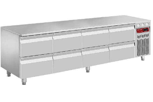 - Tiroirs avec poignée ergonomique, sur glissières télescopiques, fermeture assurée par joints magnétiques 'à pression' (remplacement aisé sans outillage).