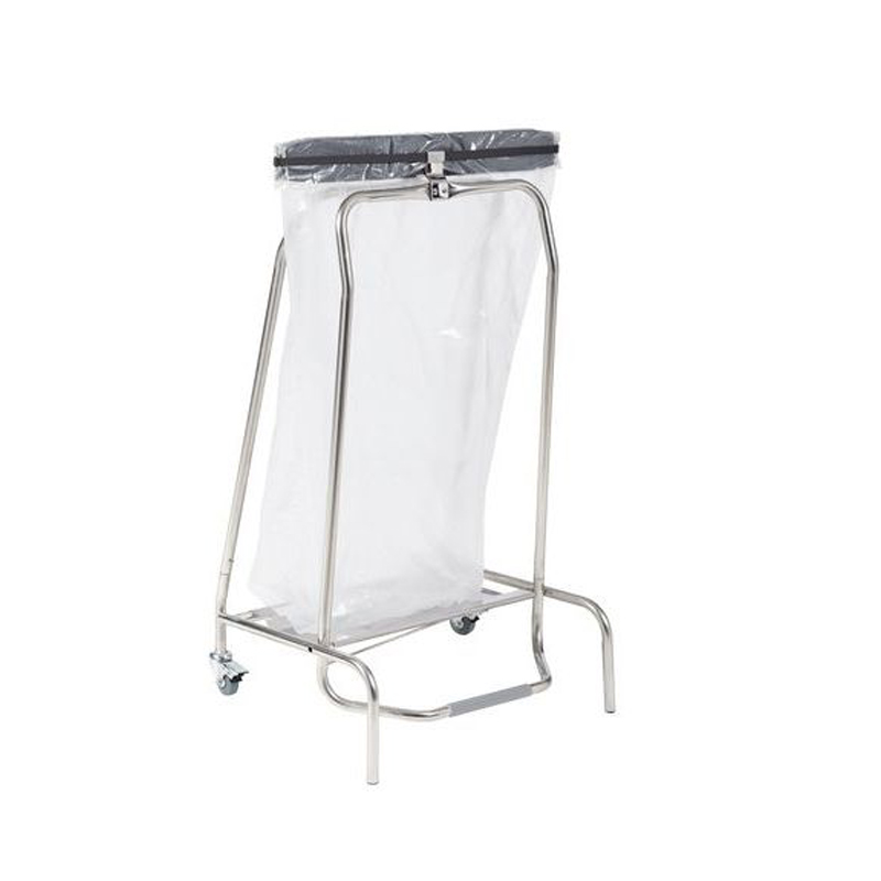 Découvrez ce support en inox de dimension 600x450x960 mm à structure tubulaire doté d'un sac de 110 L maintenu par une ceinture élastique, dans sa partie basse il contient un plateau en inox pour le soutien du sac. Ce support est mené d'un clapet constitué de lames à ressort garnies de caoutchouc pour une fermeture hermétique, de même il dispose d'une large pédale en inox avec patin en caoutchouc antidérapant et 2 roulettes avec frein pour maintenir sa stabilité et sa sécurité.