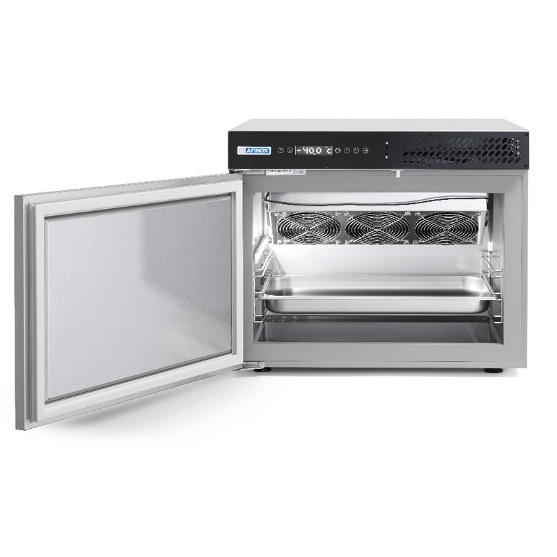 DescriptionFreezy 5 et 9 sont des congélateurs pour les refroidissement et surgélateurs rapides des aliments.Indispensables pour garantir la parfaite conservation des aliments.Le refroidissement rapide provoque un choc thermique qui inhibe la prolifération de bactéries en total conformité avec les normes HACCP, afin de prolonger la durée de conservation des aliments et de réduire la perte de poids due à l’évaporation, en maintenant la qualité des produits constant.Le refroidissement traditionnel d’un produit cuit provoque détérioration rapide.Avec les congélateurs FREZZY 5 et FREEZY 9 la période de conservation se prolonge, le parfum et les saveurs restent inchangé.Ces machines sont particulièrement adaptées pour les restaurants, les pâtisseries, bars, ou la qualité et l’organisation du travail sont importants.Le refroidissement rapide et la surgélation sont réglés par température avec sonde au cœur, ou par temps.Cycles disponibles :Refroidissement rapide (manuel ou automatique)Surgélation (manuelle ou automatique)Décongélation (manuelle ou automatique)DégivrageExportation données HACCP (port USB)Le panneau à écran tactile est intuitif et facile à utiliser.La construction est entièrement en acier inox AISI 304, ainsi que les grilles et les supports, facilement amovibles et lavable.FREEZY 9 – volume interne 75l. – 5 étagers GN 1/1 ou 12 bacs GN ¼ h 100FREEZY 5 – volume interne 46l. – 3 étagers GN 1/1 ou 5 bacs GN ¼ h 100 Fiche technique Catalogue complet