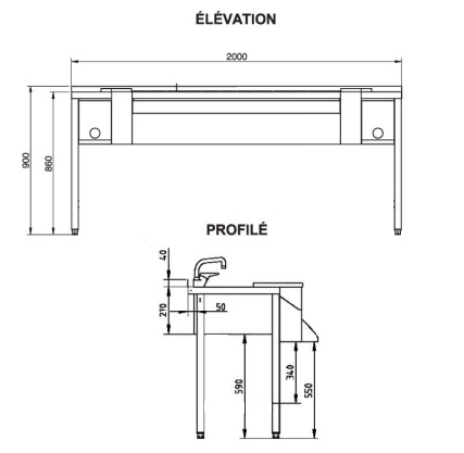 - Structure en tube d'acier inoxydable 40x40mm soudée au plan de travail