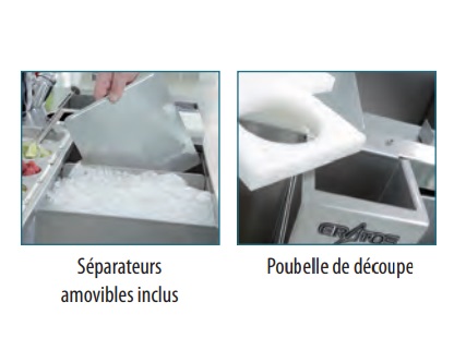 - Capacité de la cuve isolée : 3 zones pour la glace, 2 zones pour les bouteilles et 1 zone pour les bacs 12 GN 1/9-100 (plateaux non inclus dans le prix, voir kit optionnel KC-200)