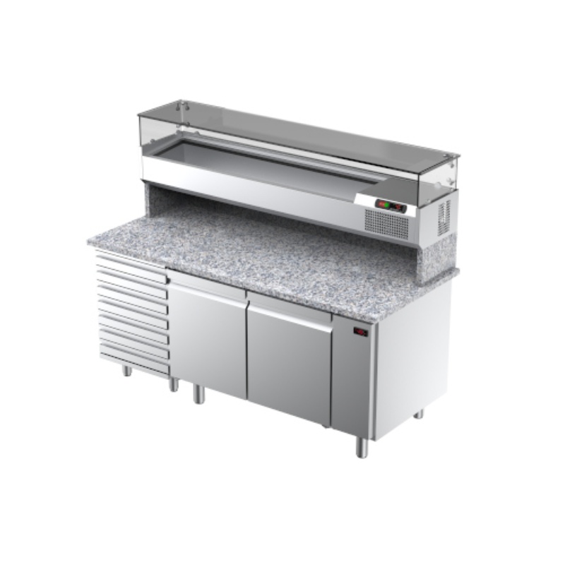 ILSA a développé une gamme complète d'équipements pour les pizzerias, conçus pour répondre aux besoins de flexibilité dans la composition des postes de travail et d'optimisation de l'espace, tout en garantissant la sécurité du stockage des ingrédients. La ligne se compose de tables de préparation d'une profondeur de 80 cm qui peuvent être personnalisées avec des éléments neutres et réfrigérés permettant de nombreuses combinaisons, pour une organisation du travail basée sur des principes de fonctionnalité et d'efficacité. Les éléments sont entièrement fabriqués en acier inox AISI 304 Cr- Ni 18/10, entièrement conformes aux normes d'hygiène et montés sur des pieds réglables. Les plans de travail sont en granit de Sardaigne ou en acier inox AISI 304 Cr-Ni 18/10.