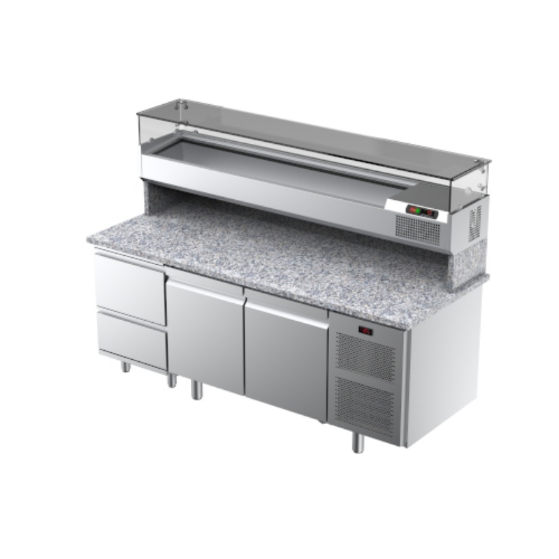 ILSA a développé une gamme complète d'équipements pour les pizzerias, conçus pour répondre aux besoins de flexibilité dans la composition des postes de travail et d'optimisation de l'espace, tout en garantissant la sécurité du stockage des ingrédients. La ligne se compose de tables de préparation d'une profondeur de 80 cm qui peuvent être personnalisées avec des éléments neutres et réfrigérés permettant de nombreuses combinaisons, pour une organisation du travail basée sur des principes de fonctionnalité et d'efficacité. Les éléments sont entièrement fabriqués en acier inox AISI 304 Cr- Ni 18/10, entièrement conformes aux normes d'hygiène et montés sur des pieds réglables. Les plans de travail sont en granit de Sardaigne ou en acier inox AISI 304 Cr-Ni 18/10.