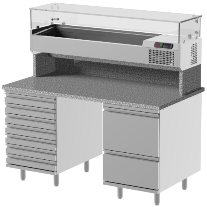 ILSA a développé une gamme complète d'équipements pour les pizzerias, conçus pour répondre aux besoins de flexibilité dans la composition des postes de travail et d'optimisation de l'espace, tout en garantissant la sécurité du stockage des ingrédients. La ligne se compose de tables de préparation d'une profondeur de 80 cm qui peuvent être personnalisées avec des éléments neutres et réfrigérés permettant de nombreuses combinaisons, pour une organisation du travail basée sur des principes de fonctionnalité et d'efficacité. Les éléments sont entièrement fabriqués en acier inox AISI 304 Cr- Ni 18/10, entièrement conformes aux normes d'hygiène et montés sur des pieds réglables. Les plans de travail sont en granit de Sardaigne ou en acier inox AISI 304 Cr-Ni 18/10.