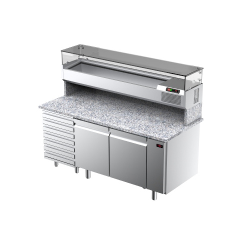 ILSA a développé une gamme complète d'équipements pour les pizzerias, conçus pour répondre aux besoins de flexibilité dans la composition des postes de travail et d'optimisation de l'espace, tout en garantissant la sécurité du stockage des ingrédients. La ligne se compose de tables de préparation d'une profondeur de 80 cm qui peuvent être personnalisées avec des éléments neutres et réfrigérés permettant de nombreuses combinaisons, pour une organisation du travail basée sur des principes de fonctionnalité et d'efficacité. Les éléments sont entièrement fabriqués en acier inox AISI 304 Cr- Ni 18/10, entièrement conformes aux normes d'hygiène et montés sur des pieds réglables. Les plans de travail sont en granit de Sardaigne ou en acier inox AISI 304 Cr-Ni 18/10.