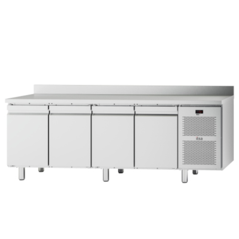 Les nouvelles tables réfrigérées NEOS sont construites avec une structure monocoque en acier inox AISI 304. Finition extérieure scotch-brite satinée ; épaisseur d'isolation de 60 mm pour le corps et de 50 mm pour les portes avec mousse à haute densité (40 kg/mc) ; dos extérieur en tôle galvanisée, en option en acier inox scotch-brite AISI 304 ; pieds en acier inox réglables en hauteur h. 140/230 mm ; chambre froide avec coins arrondis pour un meilleur nettoyage intérieur ; portes à fermeture automatique avec arrêt à 95° ; joints magnétiques des portes et des tiroirs facilement remplaçables ; groupe frigorifique monobloc ; système de ventilation canalisée à l'arrière pour une température interne parfaitement homogène ; dégivrage par gaz chauds et évaporation automatique de l'eau de condensation ; poignées ergonomiques ; compartiment technique en option à gauche dans les deux versions ; alimentation électrique standard 230V/50Hz ; gaz réfrigérant écologique R290 ; charnières supérieures et inférieures des portes fixées à l'avant du corps (interchangeables sans devoir démonter le plan de travail) ; portes réversibles.