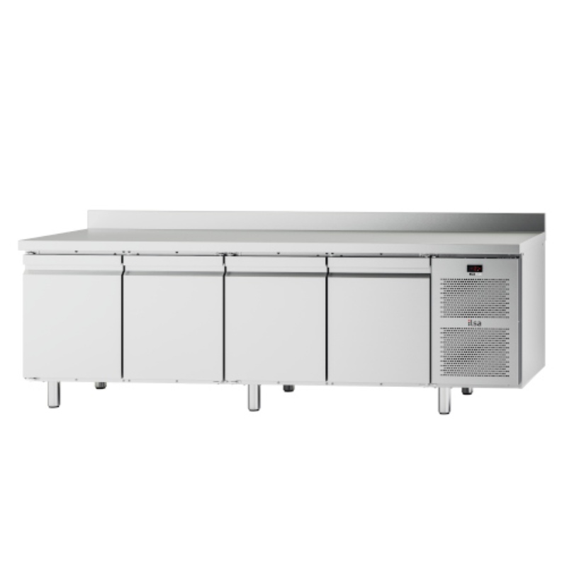 Les nouvelles tables réfrigérées NEOS sont construites avec une structure monocoque en acier inox AISI 304. Finition extérieure scotch-brite satinée ; épaisseur d'isolation de 60 mm pour le corps et de 50 mm pour les portes avec mousse à haute densité (40 kg/mc) ; dos extérieur en tôle galvanisée, en option en acier inox scotch-brite AISI 304 ; pieds en acier inox réglables en hauteur h. 140/230 mm ; chambre froide avec coins arrondis pour un meilleur nettoyage intérieur ; portes à fermeture automatique avec arrêt à 95° ; joints magnétiques des portes et des tiroirs facilement remplaçables ; groupe frigorifique monobloc ; système de ventilation canalisée à l'arrière pour une température interne parfaitement homogène ; dégivrage par gaz chauds et évaporation automatique de l'eau de condensation ; poignées ergonomiques ; compartiment technique en option à gauche dans les deux versions ; alimentation électrique standard 230V/50Hz ; gaz réfrigérant écologique R290 ; charnières supérieures et inférieures des portes fixées à l'avant du corps (interchangeables sans devoir démonter le plan de travail) ; portes réversibles.