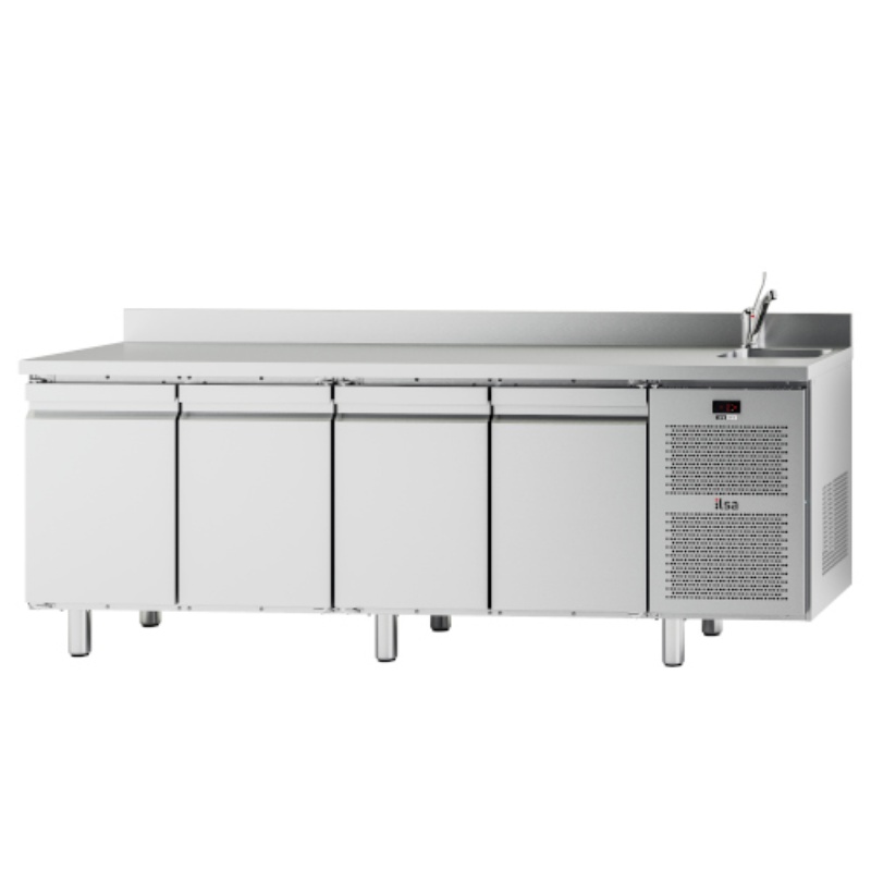 Les nouvelles tables réfrigérées NEOS sont construites avec une structure monocoque en acier inox AISI 304. Finition extérieure scotch-brite satinée ; épaisseur d'isolation de 60 mm pour le corps et de 50 mm pour les portes avec mousse à haute densité (40 kg/mc) ; dos extérieur en tôle galvanisée, en option en acier inox scotch-brite AISI 304 ; pieds en acier inox réglables en hauteur h. 140/230 mm ; chambre froide avec coins arrondis pour un meilleur nettoyage intérieur ; portes à fermeture automatique avec arrêt à 95° ; joints magnétiques des portes et des tiroirs facilement remplaçables ; groupe frigorifique monobloc ; système de ventilation canalisée à l'arrière pour une température interne parfaitement homogène ; dégivrage par gaz chauds et évaporation automatique de l'eau de condensation ; poignées ergonomiques ; compartiment technique en option à gauche dans les deux versions ; alimentation électrique standard 230V/50Hz ; gaz réfrigérant écologique R290 ; charnières supérieures et inférieures des portes fixées à l'avant du corps (interchangeables sans devoir démonter le plan de travail) ; portes réversibles.