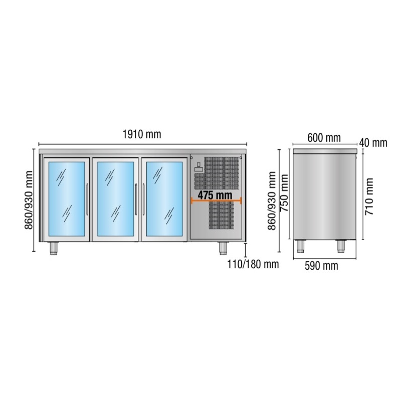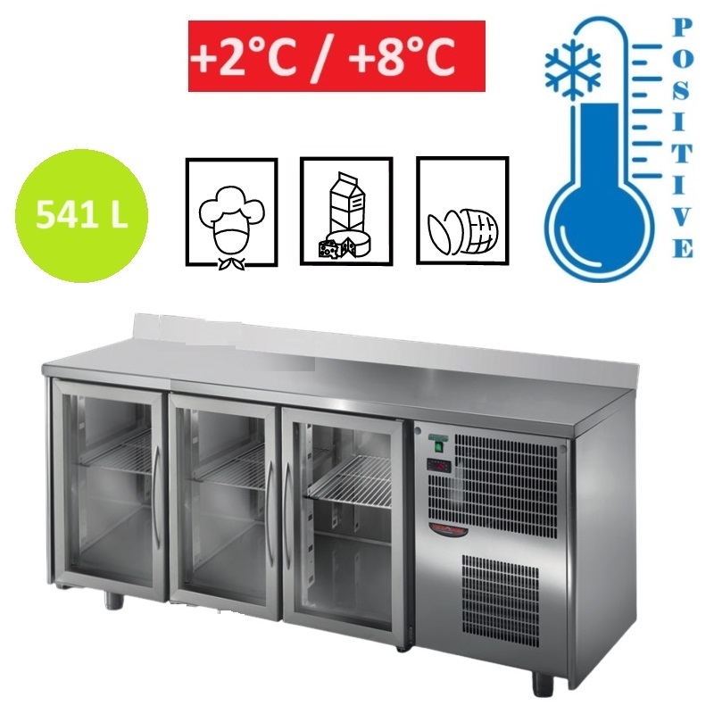 Découvrez la Table Réfrigérée 3 Portes Vitrées avec Dosseret de la marque Tecnodom, équipée d'un groupe frigorifique pour répondre à tous vos besoins en matière de réfrigération professionnelle.