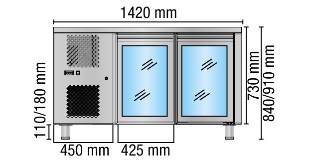 Dotée de dimensions de 1420x700x1150/1200 mm et d'un volume utile de 210 litres, cette table réfrigérée offre suffisamment d'espace pour stocker vos produits gastronomiques, produits laitiers et charcuteries dans des conditions optimales. Son groupe frigorifique ventilé maintient une température constante entre +2 °C et +8 °C, préservant ainsi la fraîcheur de vos aliments.