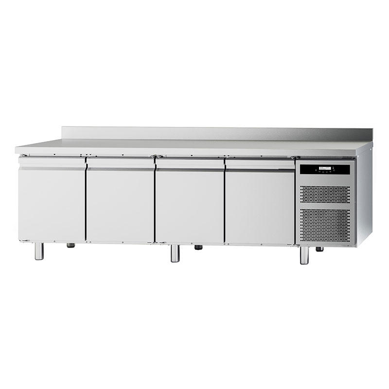 Les nouvelles tables réfrigérées Evolution sont construites avec une structure monocoque en acier inox AISI 304 ; finition extérieure scotch-brite satinée ; épaisseur d'isolation de 60 mm pour le corps et de 50 mm pour les portes avec mousse à haute densité (40 kg/mc) ; dos extérieur en acier inox AISI 304 scotch-brite ; pieds en acier inox réglables en hauteur h. 140/230 mm ; chambre froide avec coins arrondis pour un meilleur nettoyage intérieur ; portes à fermeture automatique avec arrêt à 95° ; joints magnétiques des portes et des tiroirs facilement échangeables ; groupe frigorifique monobloc amovible pour faciliter l'entretien ; système de ventilation à l'arrière pour une température intérieure parfaite et homogène ; dégivrage par gaz chauds et évaporation automatique de l'eau de condensation ; poignées ergonomiques ; filtre de condenseur en acier inox de série ; fond extérieur en acier inox en option ; alimentation électrique 230V/50Hz de série ; gaz réfrigérant écologique R290 ; charnières de porte supérieure et inférieure fixées à l'avant du corps (interchangeables sans devoir démonter le plan de travail) ; portes réversibles.